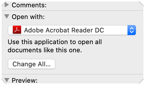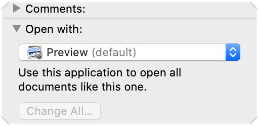 창이 하나 뜨는데 그 항목 중 'Open with' 항목을 보면 'Preview'란 앱이 기본으로 설정되어 있습니다.