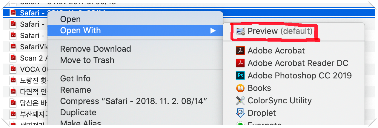 PDF 파일의 경우를 예로 보겠습니다. PDF 파일에서 마우스 오른쪽 클릭하고 'Open With' 항목을 보시면 default로 'Preview'란 이름의 앱이 실행될 것이라 명시되어 있습니다. 다시 말해, PDF 파일을 더블클릭 했을 때 'Preview'란 앱에서 보여지게 된다는 것이죠. 이 기본 앱을 Acrobat Reader로 변경해 보겠습니다.