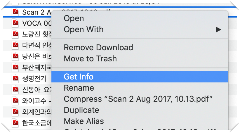 PDF 파일에서 마우스 오른쪽 클릭 후 'Get Info'를 선택.