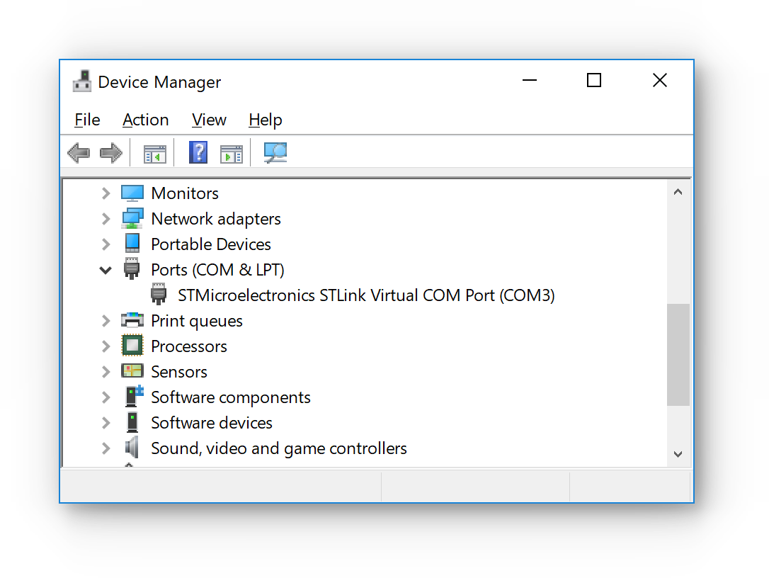 위 드라이버가 제대로 설치되었다면 EVB를 USB로 연결했을 때, 윈도우 장치관리자에서 아래와 같이 'STMicroelectronics STLink Virtual COM Port'라는 이름의 장치가 보입니다.