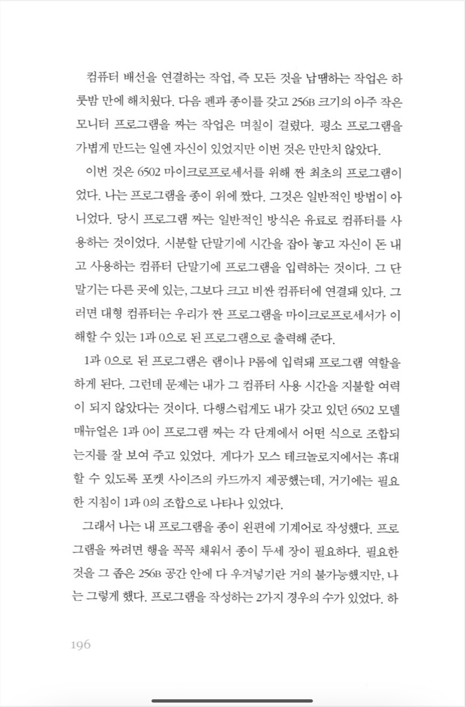 따라서 나는 롬 칩도 필요했다. 컴퓨터를 자동으로 부팅시키는 그런 프로그램을 만들어야 했기 때문이다. 알테어나 크림소다 컴퓨터는 프로그램을 입력하려면 스위치를 켠 다음 30분가량 지나야 했다. 애플I은 프로그램 가져오는 기능을 메모리에 간편하게 집어넣고 싶었다. 그러려면 컴퓨터를 켜자마자 작동되는 작은 프로그램을 만들어야 했다. 이 프로그램을 통해 컴퓨터는 키보드 입력 정보를 읽을 것이고, 우리는 데이터를 메모리에 저장할 수 있으며, 메모리에 어떤 데이터가 있는지도 알 수 있다. 그리고 프로세서가 메모리의 특정 위치에 있는 프로그램을 돌리도록 만들 수 있다. 알테어로는 프로그램 돌리는데 30분이 걸렸지만 애플I으로는 키보드를 이용해 1분도 채 걸리지 않았다.