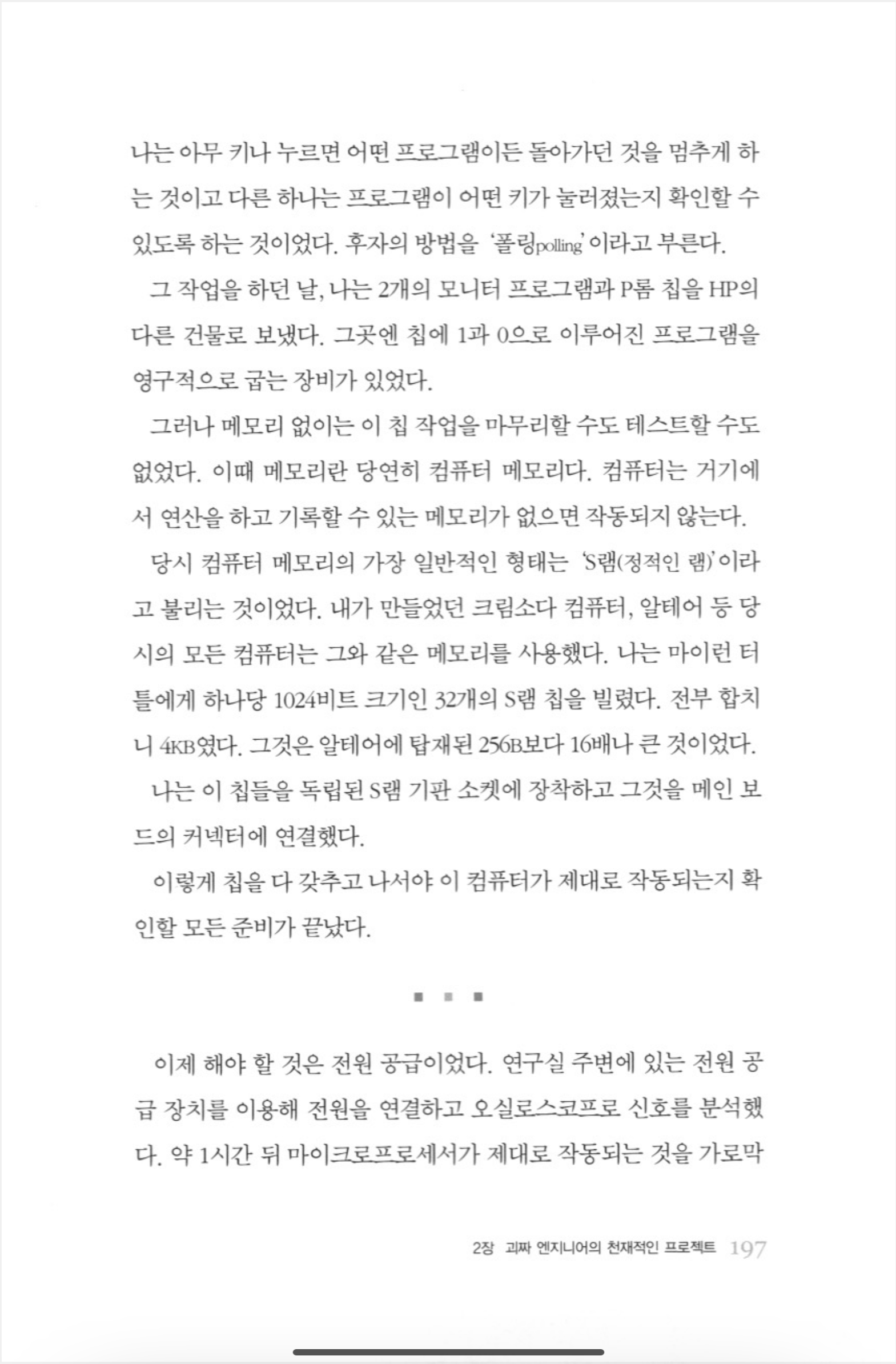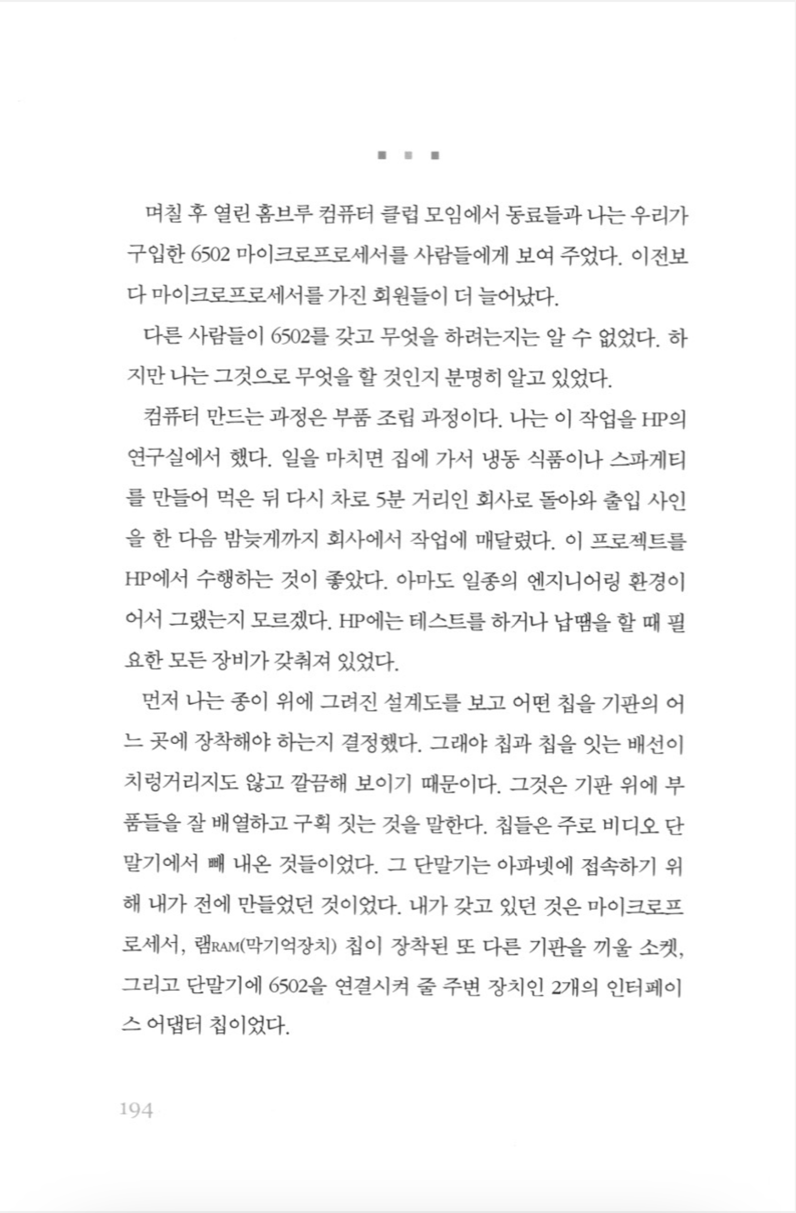 애플I을 설계하기 전까지의 이야기는 그냥 신변잡기로 읽힌다. 그러다가 애플I을 설계하는 이야기에서 몰입하게 되는데... 아래에 그 내용을 카피해 본다.