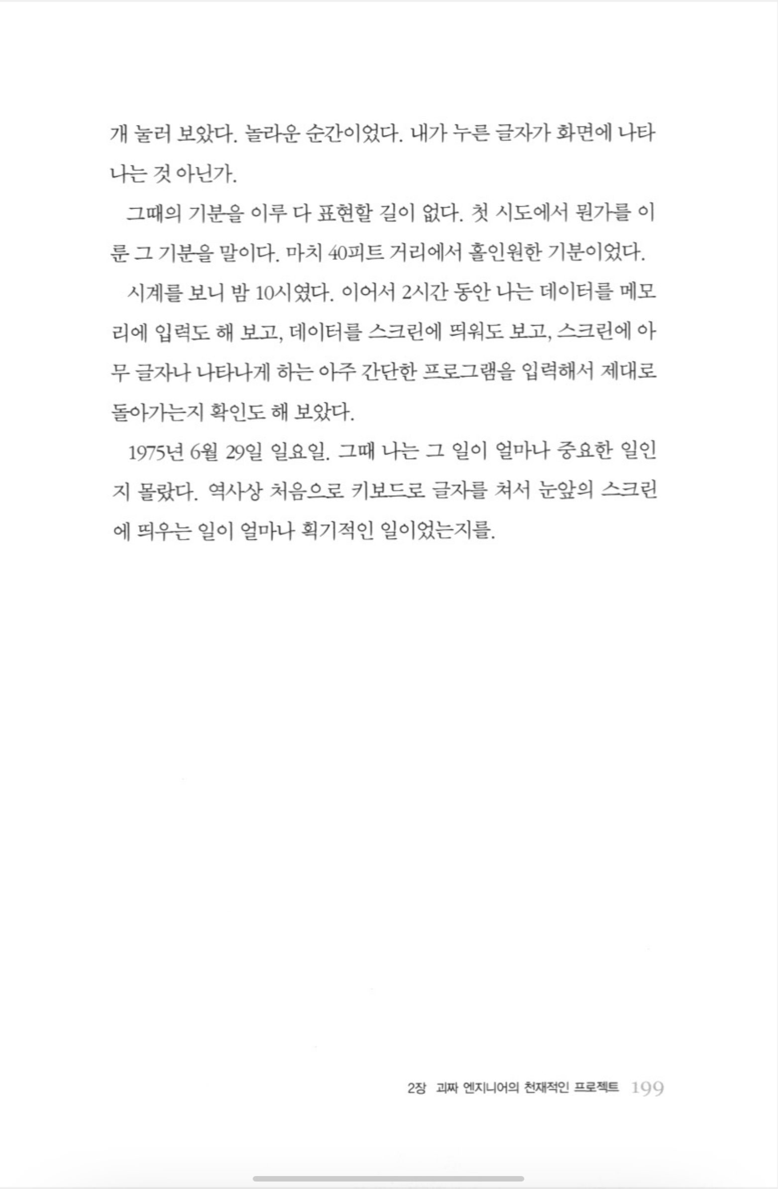 그보다 앞서 깨달았던 것은 HP 계산기가 사실상의 컴퓨터라는 사실이었다. 알테어나 크림소다 컴퓨터와 견주어 다를 바가 없었다. 계산기에도 프로세서와 메모리가 있었다. 대신 계산기는 켜자마자 사용 준비가 되었다. 즉, 그 안에 프로그램이 있어서 켜는 순간 바로 숫자를 입력할 수 있었다. 자동 부팅이 되는 것이기 때문에 우리는 바로 무언가를 할 수 있다.