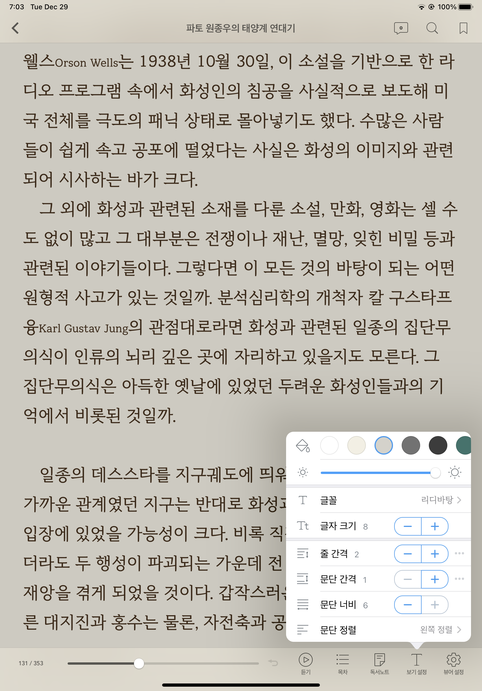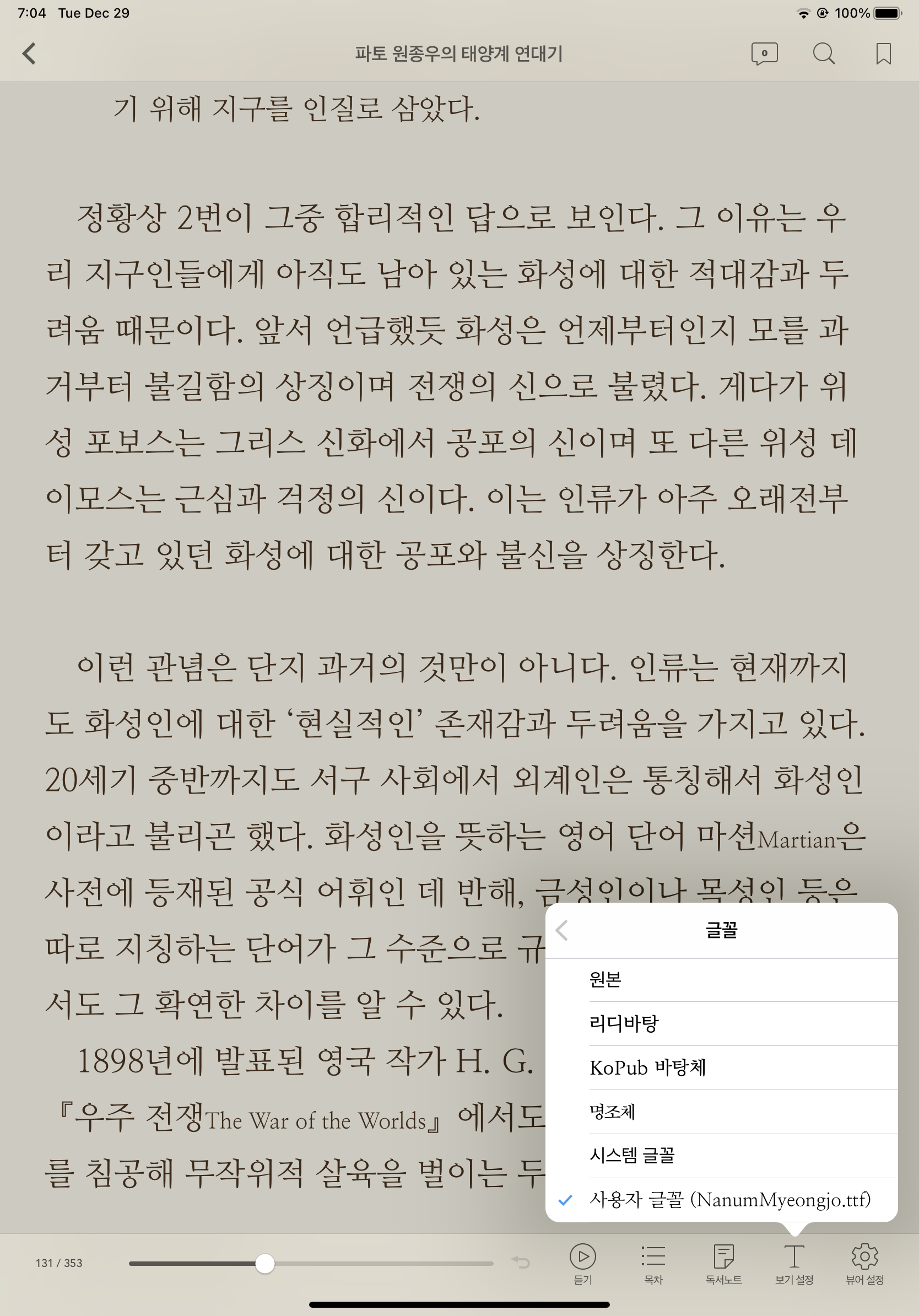 아이패드의 리디북스에서 기본 폰트로는 가독성 좋은 리디바탕체를 사용해왔습니다. 이 서체는 앱에 기본으로 설치되어 있죠. 하지만 계속 이 폰트만 사용하다 보니 지겹기 시작합니다. 그래서 다른 폰트를 설치해보기로 합니다.