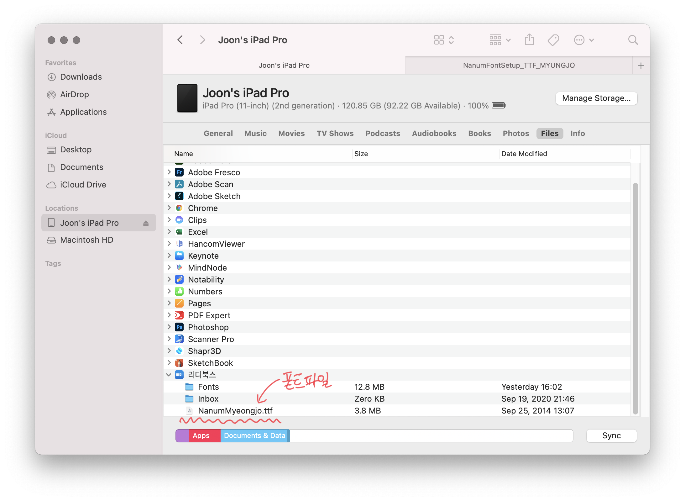 macOS 환경에서 아이패드의 리디북스 앱에 폰트를 설치하고 해당 글꼴로 보기 설정하기.