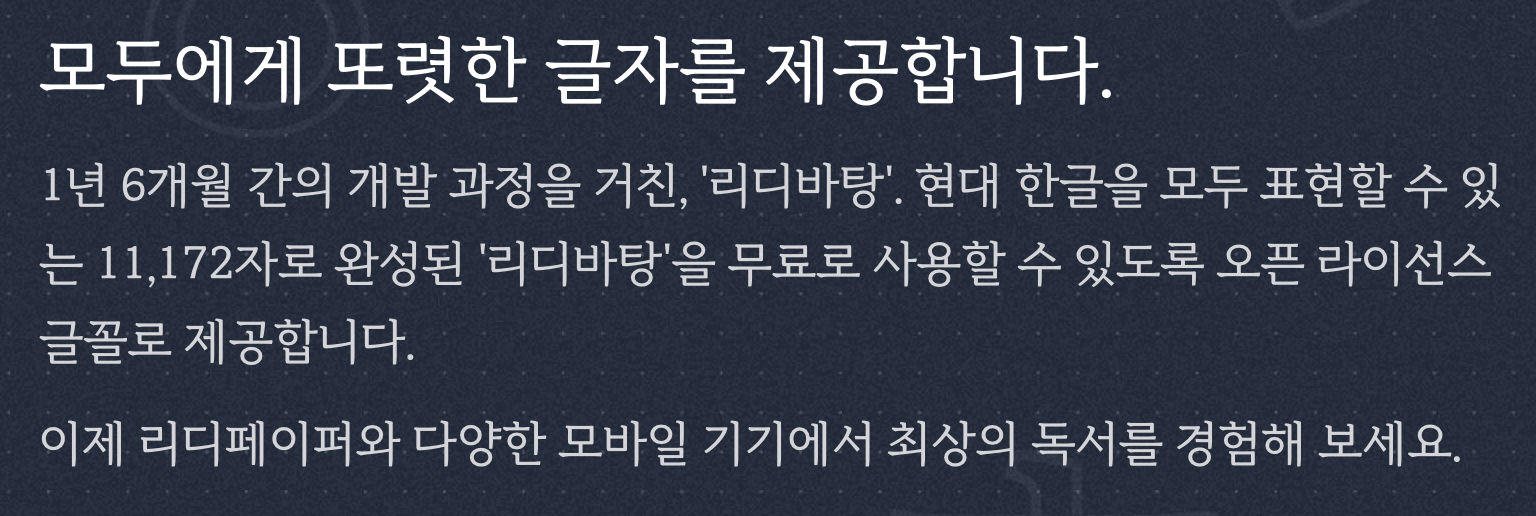 라이선스 안내 리디바탕 글꼴은 개인 및 기업 사용자를 포함한 모든 사용자에게 무료로 제공되며 자유롭게 수정하고 재배포하실 수 있습니다. 단, 글꼴 자체를 유료로 판매하는 것은 금지하며,
