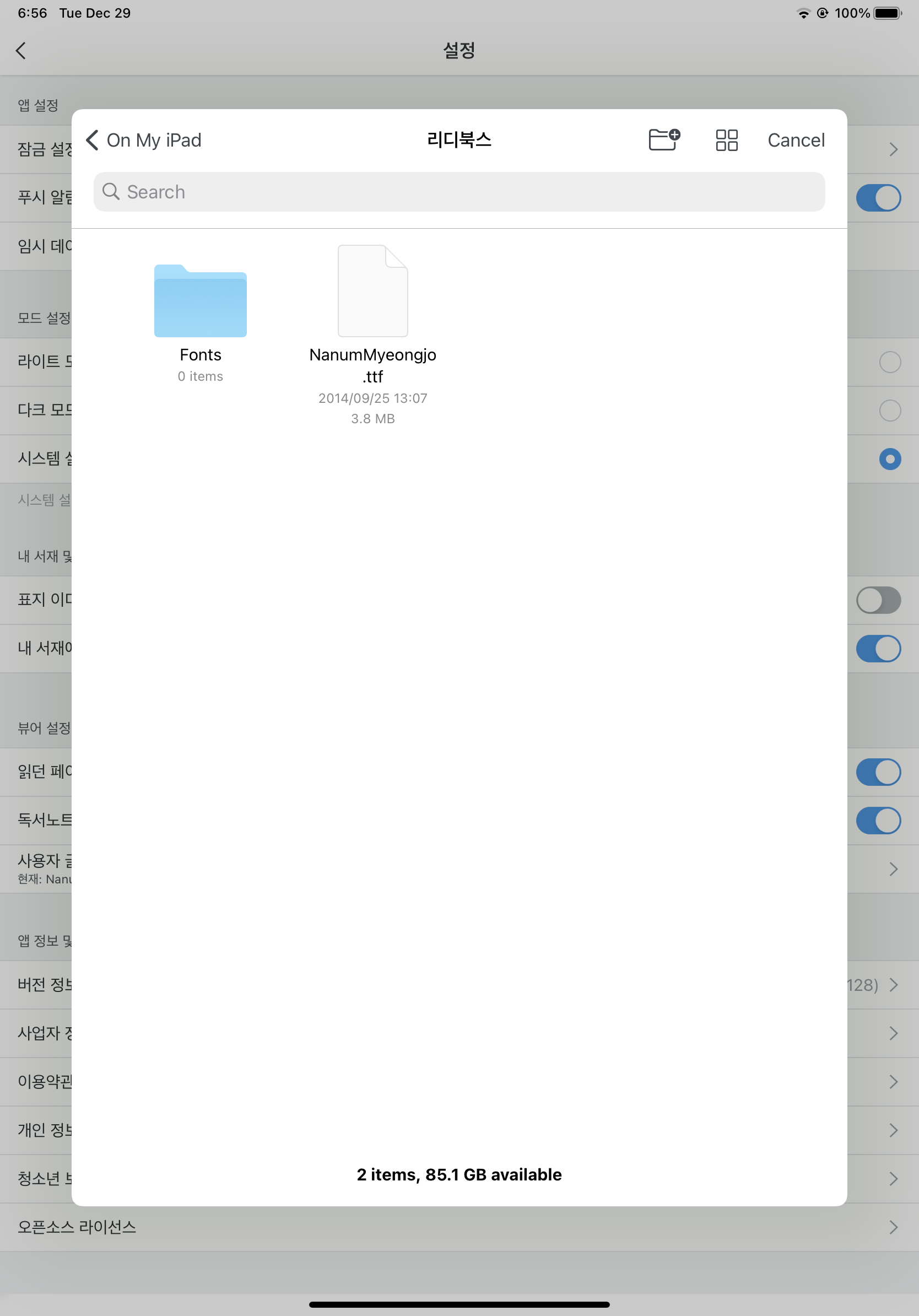 리디북스 앱 아래 'Fonts'라는 폴더가 있지만 꼭 이곳에 폰트파일이 있어야 하는 것은 아닙니다.