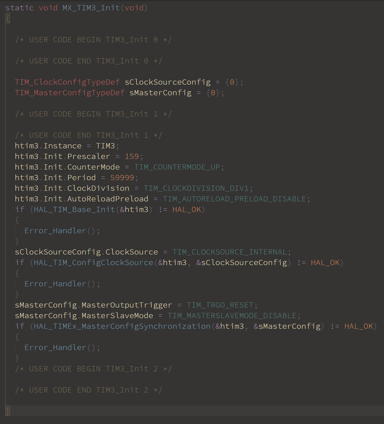 이제 CubeMX에서 전체 코드를 생성하고 Timer3 설정부분의 코드가 아래와 같은지 확인한다.