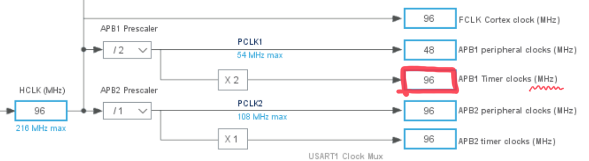 다음엔, STM32Cube-MX Clock Configuration에서 APB1 버스의 클럭이 얼마로 설정되어 있는지 확인한다. (디바이더로 조정 가능하다)