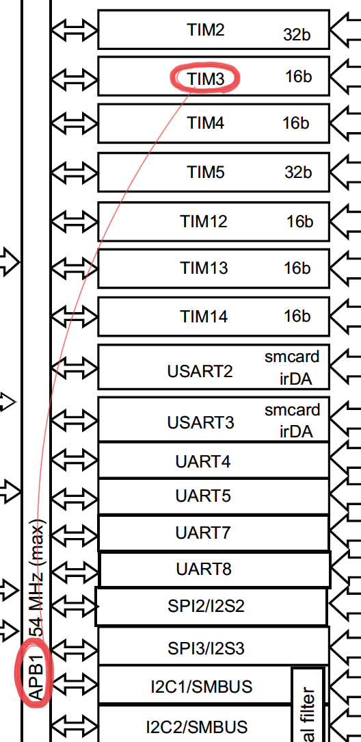 위 블록다이어그램의 일부에서 확인 가능하듯이 Timer3는 APB1 버스에 연결되어 있다.