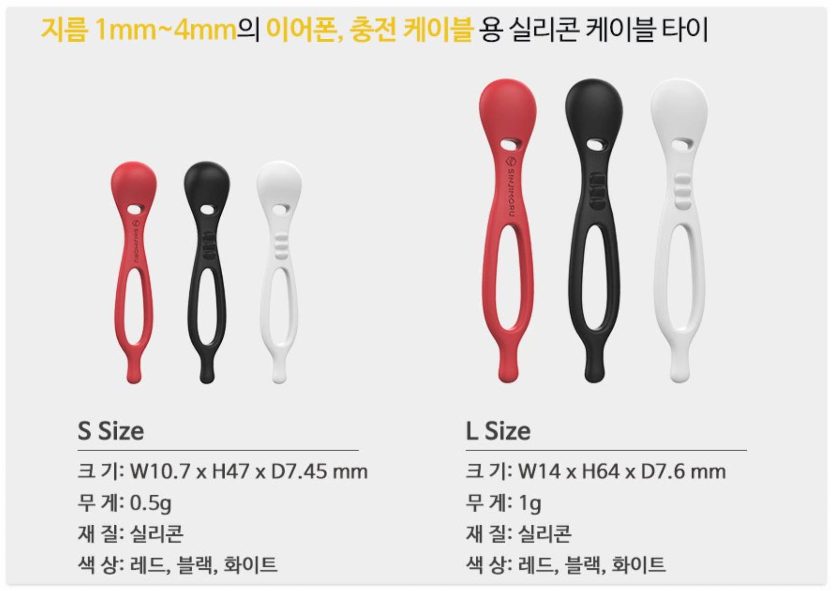 실리콘 재질이라 몇 번이고 조였다 풀었다 가능하며, 이어폰 줄이나 1m짜리 스맛폰 케이블을 정리하는 데 사용하려면 S 사이즈가 딱입니다. 사이즈는 S, L, XL, XXL 4가지이며, 1세트 3개씩 들어있고 1,500원 정도입니다.