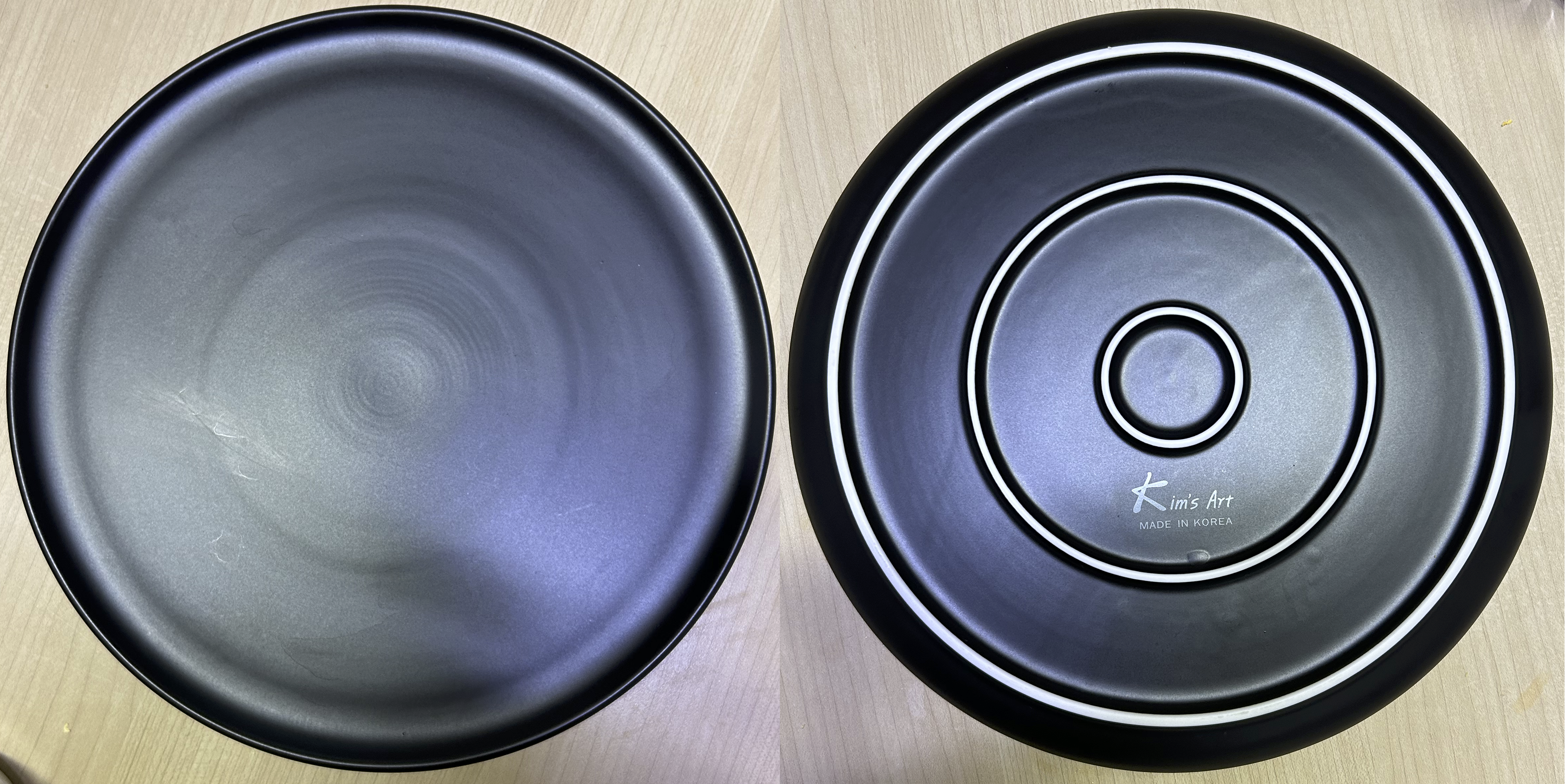 킴스아트 평원형접시. 흰색과 검은색 두 가지, 사이즈는 1, 2, 3호 세 가지가 있었고, 제일 큰 사이즈인 3호(27.4㎝)가 냉동 피자와 딱 맞았습니다. 도자기 재질이라 좋네요. 좀 아쉬운 점이 있다면 사진에서처럼 피자 사이즈와 너무 딱 맞습니다. 직경이 1㎝ 정도 더 컸더라면 좋았을텐데 말이죠.