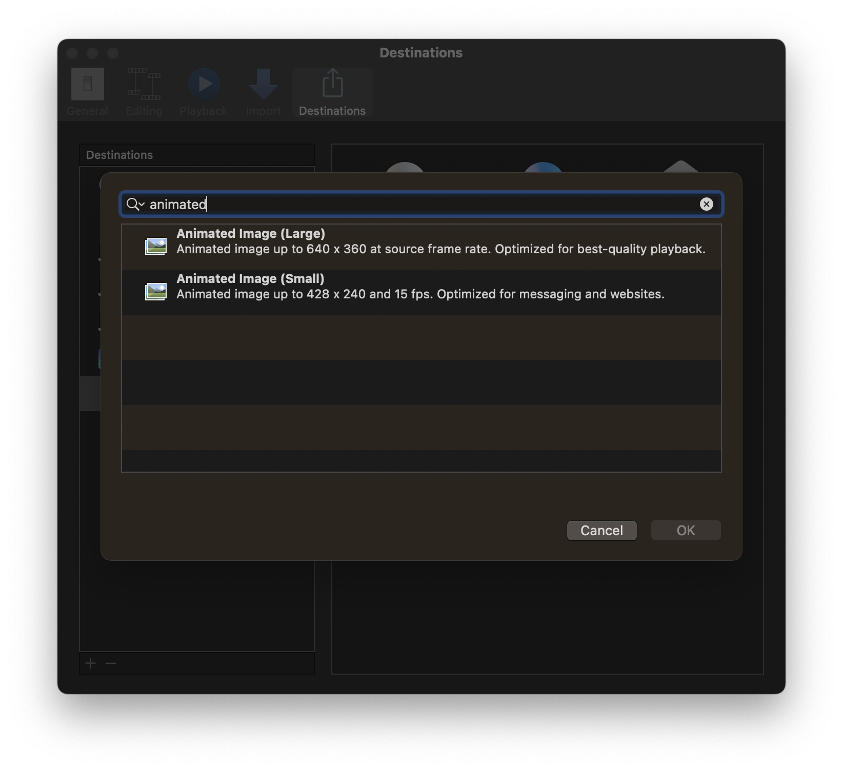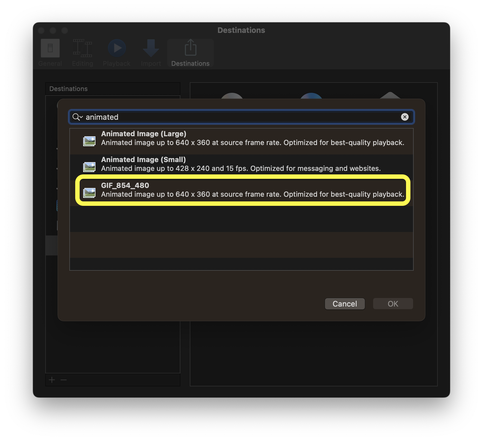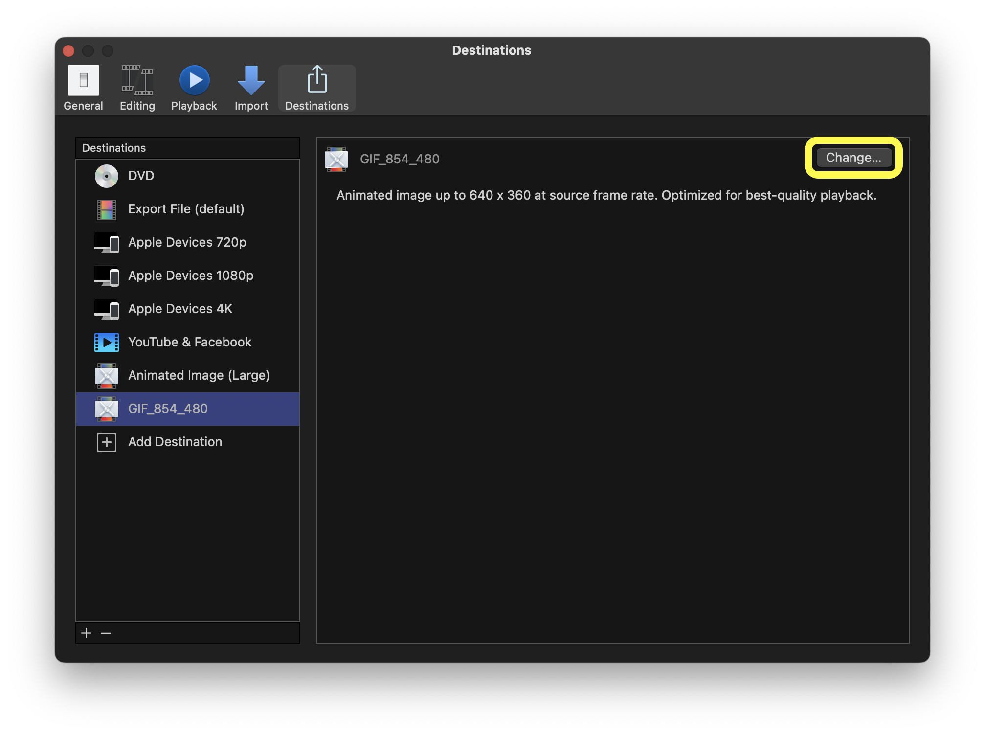 File ➟ Share ➟ Add Destination... ➟ GIF_854_480 ➟ Change... 버튼을 눌러 해당 설정값을 다시 읽어들입니다.