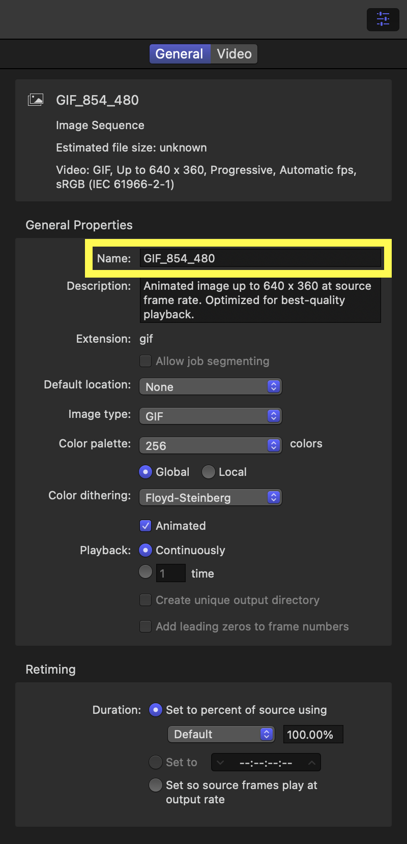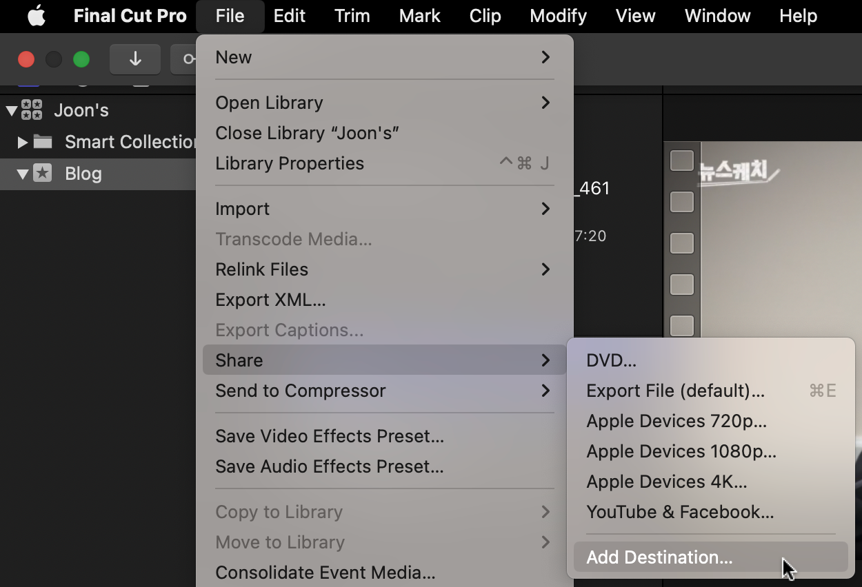 해상도를 854 × 480로 변경합니다. 다시 FCB로 돌아갑니다. File ➟ Share ➟ Add Destination... ➟ + Add Destination ➟ Compressor Settings