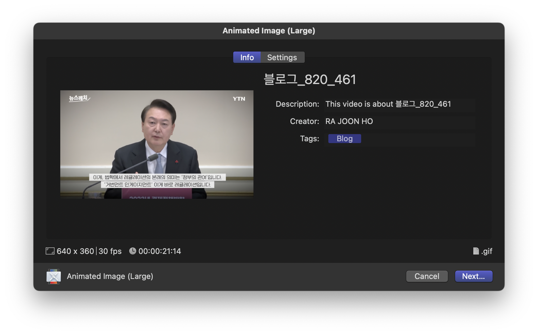 창이 뜨면 하단의 'Next...' 버튼을 눌러 원하는 위치에 생성될 GIF를 저장합니다.