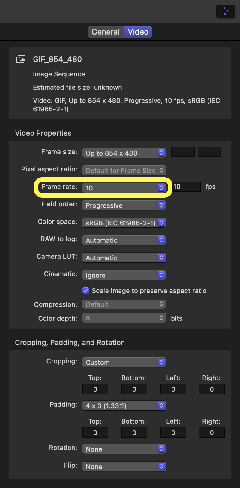 음... 어떻게 해상도를 유지하면서 용량을 줄이지... fps를 변경해 봅니다. 10fps로 강제해 보겠습니다. Compressor로 갑니다.