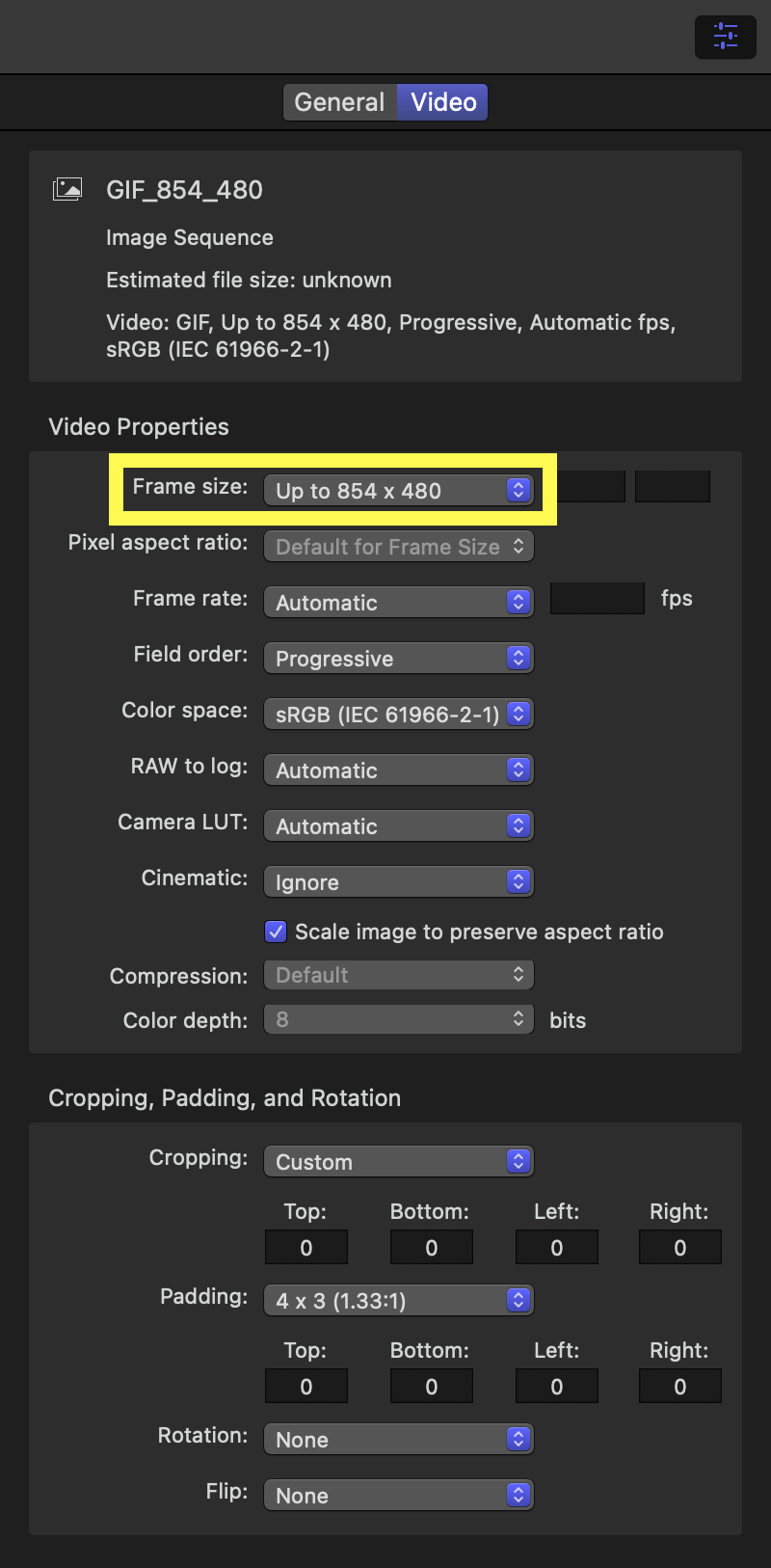 위 GIF는 해상도가 미리 설정된 값이다보니 제가 원하는 것이 아닙니다. 제가 블로그에 사용하기 위해 GIF 해상도를 854 × 480으로 설정하고 싶습니다. 빌트인 설정값을 변경해서 목표를 달성합니다.