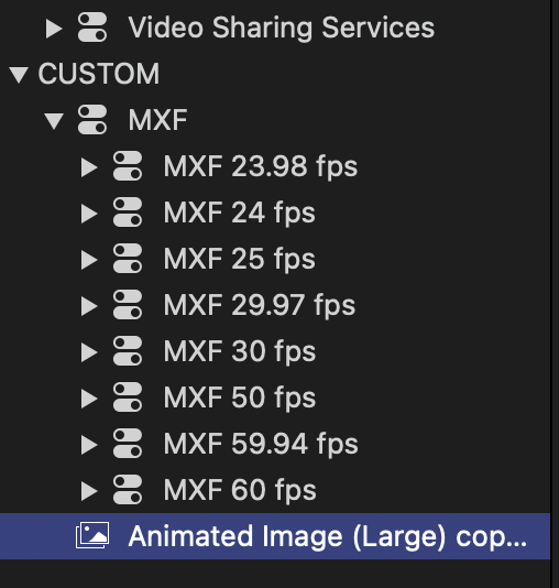 아래쪽 CUSTOM 항목 아래에 복사된 'Animated Image (Large) Copy' 설정값이 보입니다. 오른쪽 창에는 아래와 같이 이 설정값의 세부사항이 나타납니다.