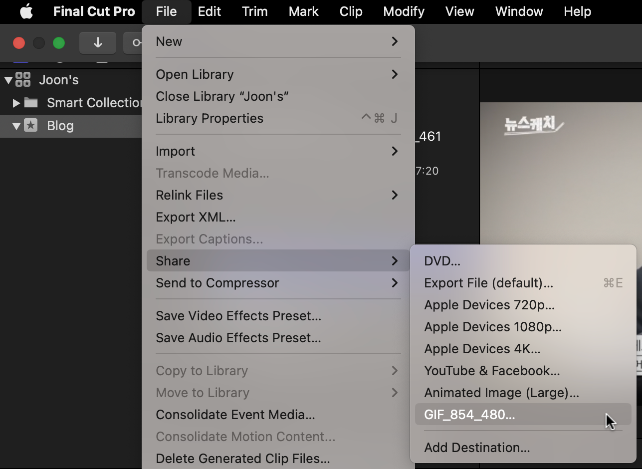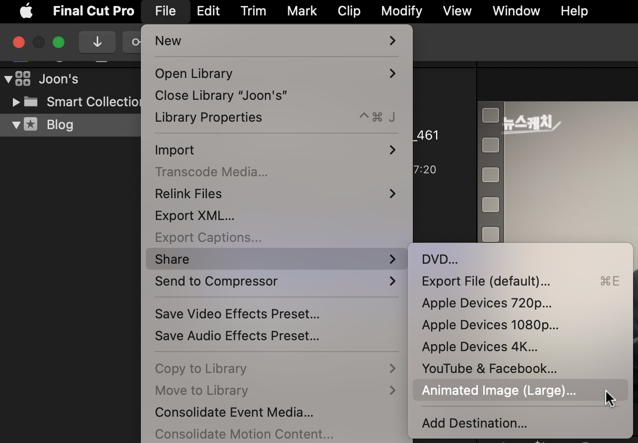 움직이는(animated) GIF 파일을 만들 수 있도록 지원하는 사이트가 있기는 하지만 처음부터 끝까지 내가 원하는 대로 영상을 편집하고, 원하는 사양대로 GIF 파일을 만들고 싶다면 동영상 툴을 하나 다룰 줄 아는 게 필요합니다. macOS에서는 Final Cut Pro(FCP)가 대중적이므로, 이 앱에서 animated-GIF 만들기를 해봅니다.