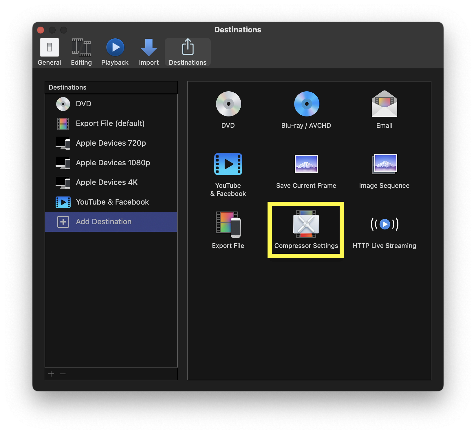 새로 뜨는 창에서 '+ Add Destination ➟ Compressor Settings'
