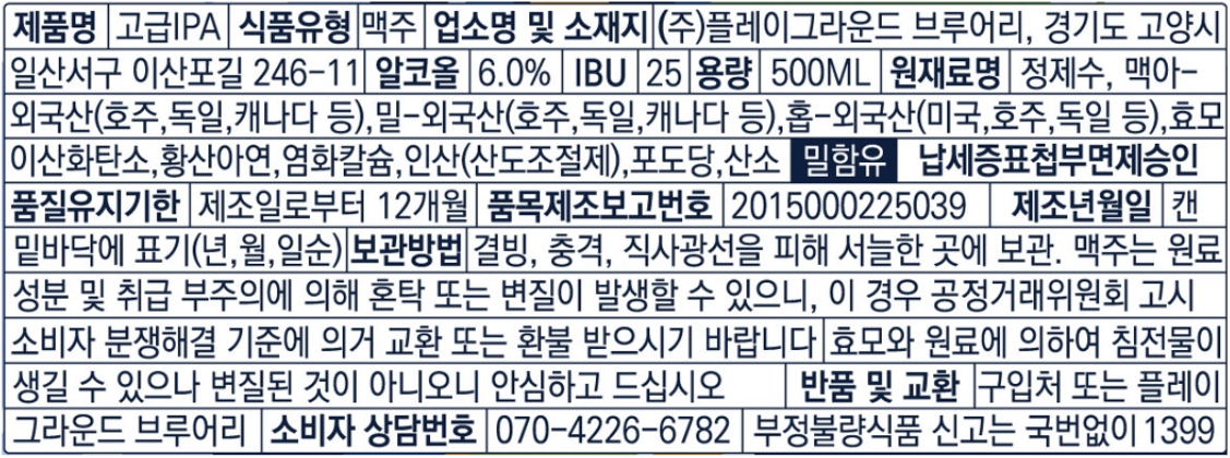 플레이그라운드 브루어리의 '고급 IPA', 벨지안 IPA란다. 같은 브루어리에서 생산한 '빅슬라이드 IPA'에 호감을 갖고 있던 터라 이 맥주도 한 박스 구입했는데... 웬걸... 실망이다. IPA 특징인 강한 홉의 향과 맛도 덜한듯하고 내가 좋아하는 씁쓸한 맛도 많이 약하다. 특히, 끝맛에 이상한 잡맛이 강하게 난다. 앞으로는 '빅슬라이드 IPA'만 구입할 듯하다.