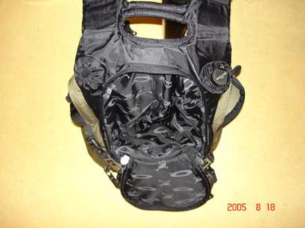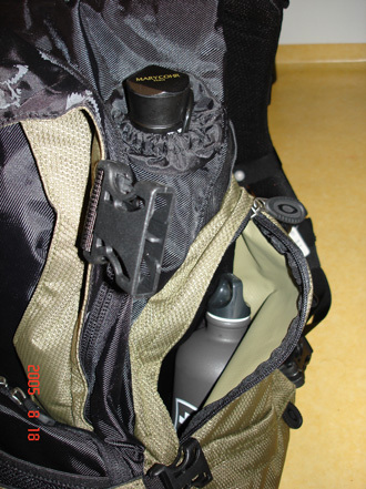 양 사이드로 두개씩의 포켓과 먼가를 넣도록 되어있는 구멍이 하나씩 있었는데, 난 위 사진처럼 구멍에는 우산을 넣고 사이트 포켓 한쪽엔 SIGG 물병(1.0L)을 넣었다.