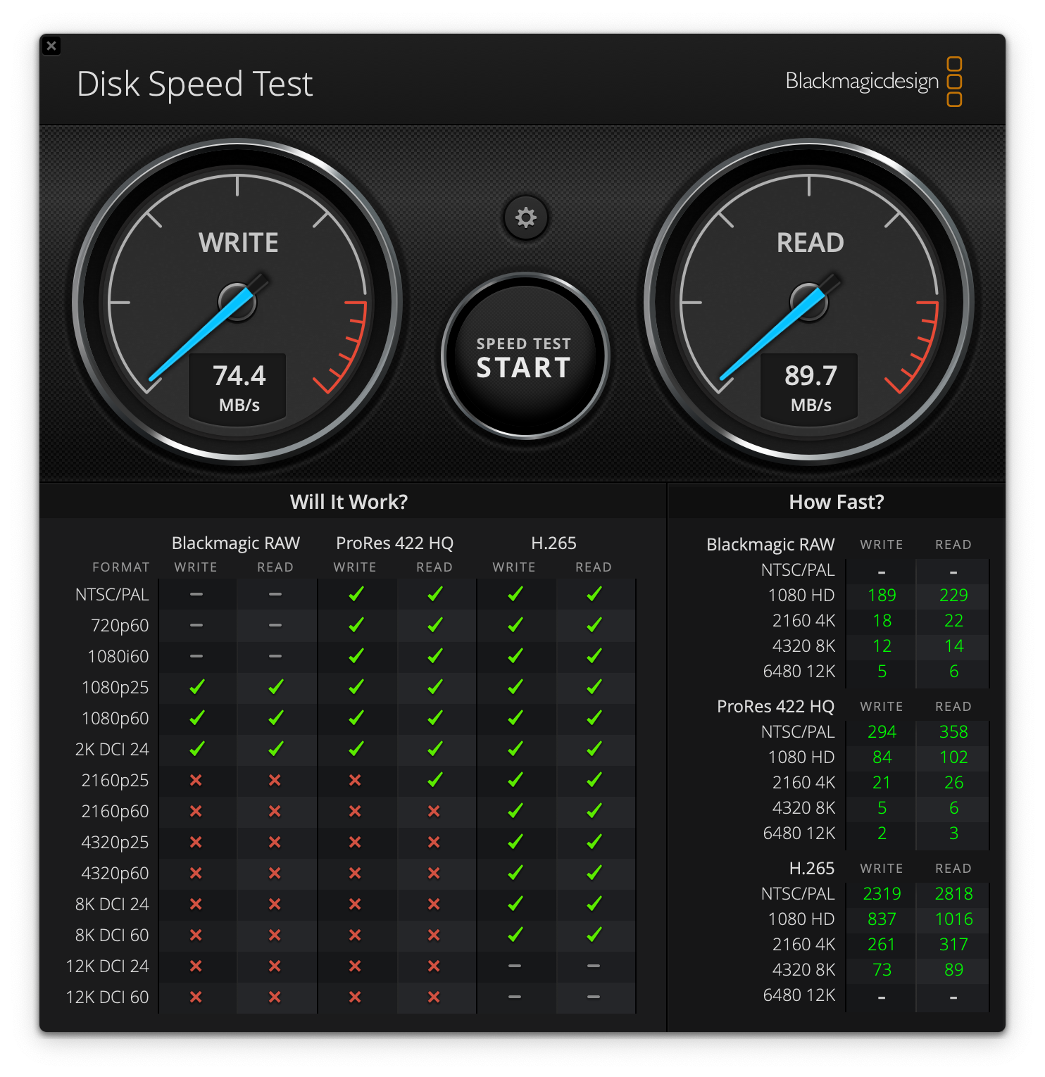 제품 전면에 200MB/s라 광고하지만 테스트시 최대 속도는 89MB/s에 그쳤다.
