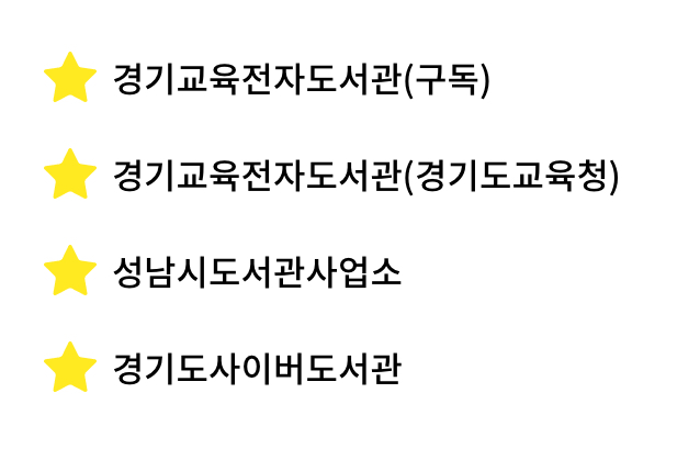 성남시 도서관, 경기도 도서관, 경기도교육청 도서관, 요렇게 세 군데 가입을 하고, 앱 내에서 즐겨찾기 등록을 하면 이용하기 편하다. 생각보다 많은 종류의 eBook을 만날 수 있어 처음에 좀 놀랐다. 좀 아쉬운 건, 기기간 싱크가 안된다는 것.