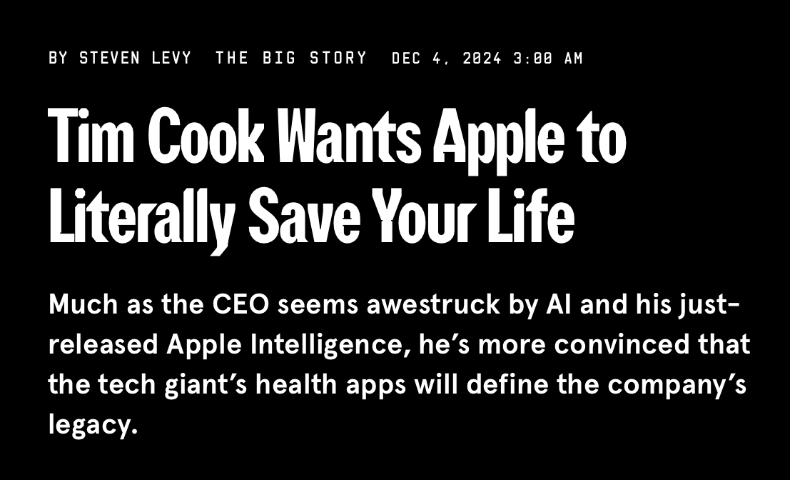 팀 쿡은 AI와 신제품 ‘애플 인텔리전스’에 경이로움을 느끼는 듯하지만, 애플의 유산을 정의할 기술은 건강 앱이 될 것이라 확신한다.